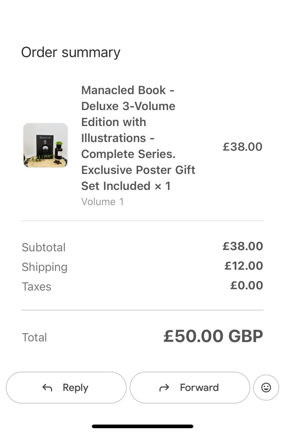 I purchased Manacled Book - Deluxe 3-Volume Edition with Illustrations and what I received was one 1 volume (only one book). I tried contacting them and they never replied.